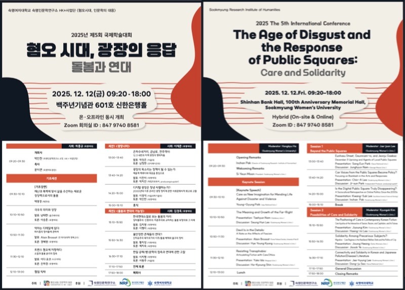 숙명인문학연구소 인문한국플러스(HK+) 사업단은 12월 12일(금) ‘혐오 시대, 광장의 응답: 돌봄과 연대’를 주제로 창학 120주년 기념 제5회 국제학술대회를 개최하였다. 백주년기념관 신한은행 홀에서 개최된 이번 학술대회는 온·오프라인에서 동시 진행되었다.